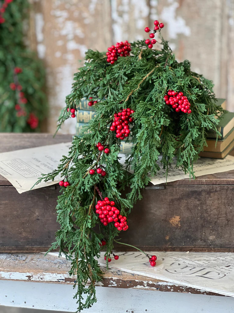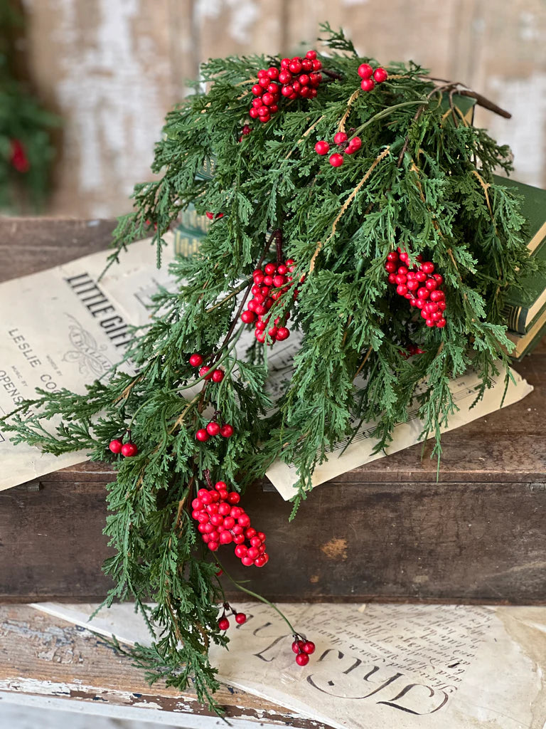 Emerald Falls with berries adds a zest of festivity with its gorgeous soft touch greenery that has a draping nature and verdant color with contrasting pops of red in berry clusters and sprigs. Definitely not one to be missed!