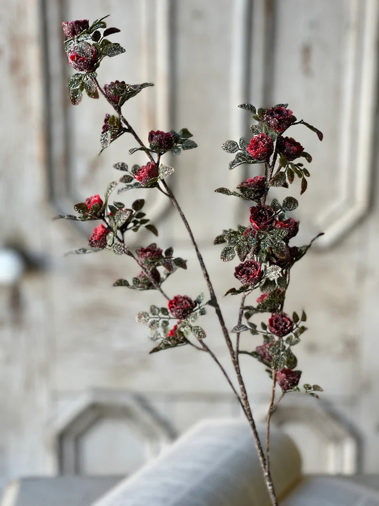 Small tea roses with a snowy, glittery finish look like they truly are the last rose of summer. Pretty leaves in a dusky finish only further the nostalgic feeling that this collection evokes.