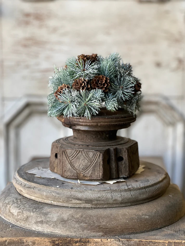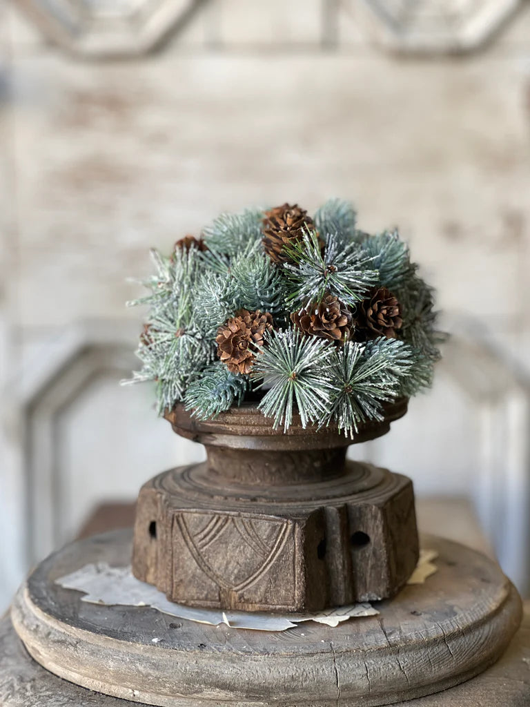 Mixed greenery with a frosty, snowy finish is peppered with petite pine cones to give a woodsy feel. The petite nature of this collection lends itself to a myriad of uses and is sure to be a charmer!