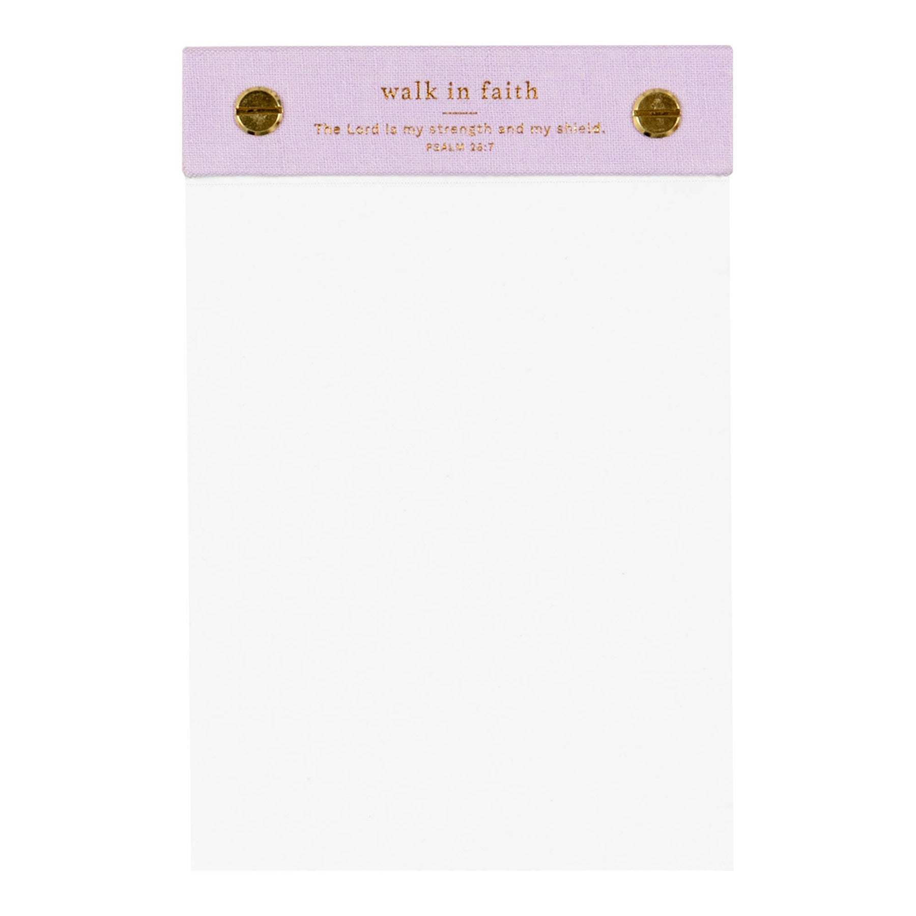 Introducing our Walk In Faith Desktop Notepad , beautifully adorned with gold accents. This elegant notepad is perfect for jotting down notes, reminders, or i piring thoughts throughout your day. Its charming design features a verse from Psalm 28:7. Our Walk In Faith Desktop Notepad serves as a daily reminder to prioritize prayer within our daily walk, making it a delightful addition to any workspace or office. Whether for personal use or as a thoughtful gift, this notepad will i pire and uplift! Features: 120 blank perforated pages edged in gold foil Size: 4" x 6" Design: Walk In Faith; " The Lord Is My Strength And My Shield" - Psalm 28:7