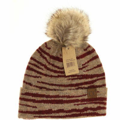 Zebra Pattern Faux Fur Pom Beanie HAT3607: Burgundy