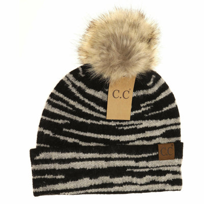 Zebra Pattern Faux Fur Pom Beanie HAT3607: Black