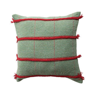Woven Recycled Cotton Blend Pillow With Braided Embroidery, Grid Pattern & Fringe, Green & Red