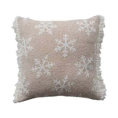 Woven Recycled Fabric Jacquard Two-Sided Pillow With Snowflake Pattern & Fringe, Beige & Natural
