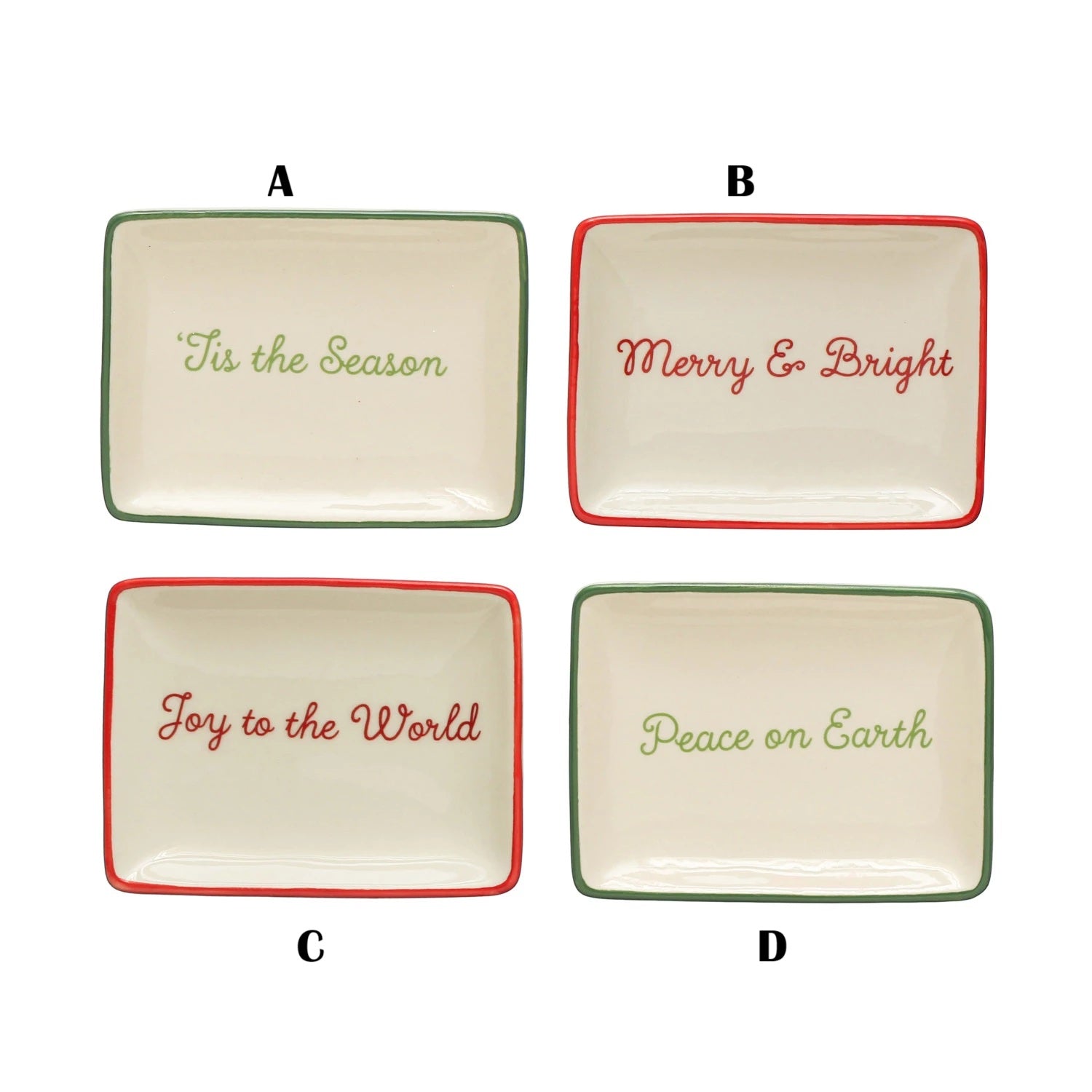 Stoneware Dish With Holiday Words & Red/Green Rim, Cream, 4 Style Options