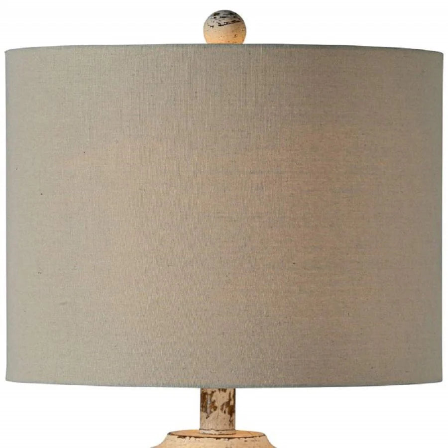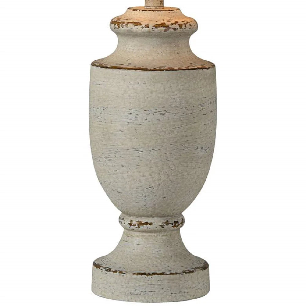 A textured hand-painted finish gives this resin lamp a look of timeworn wood finished in a distressed whitewash! It's a beautiful urn shape base with a is topped off with a natural drum shade and matching distressed whitewashed harp and finial. Its neutral color makes it an easy choice for any decor.