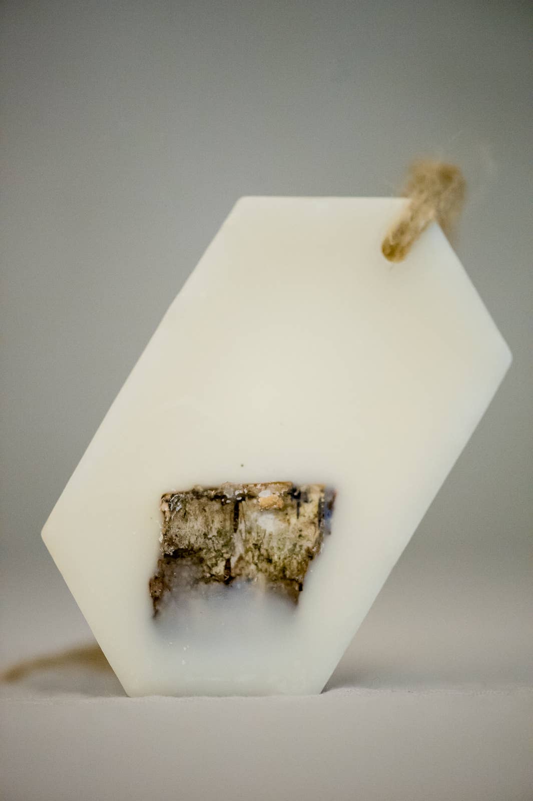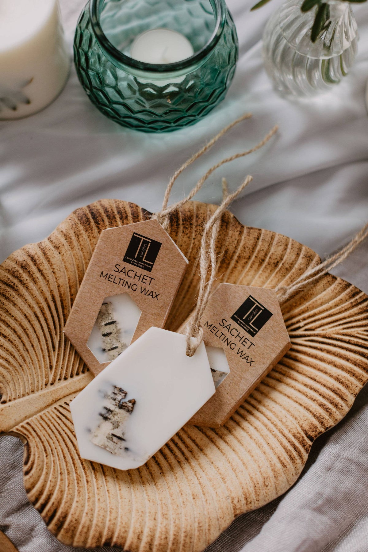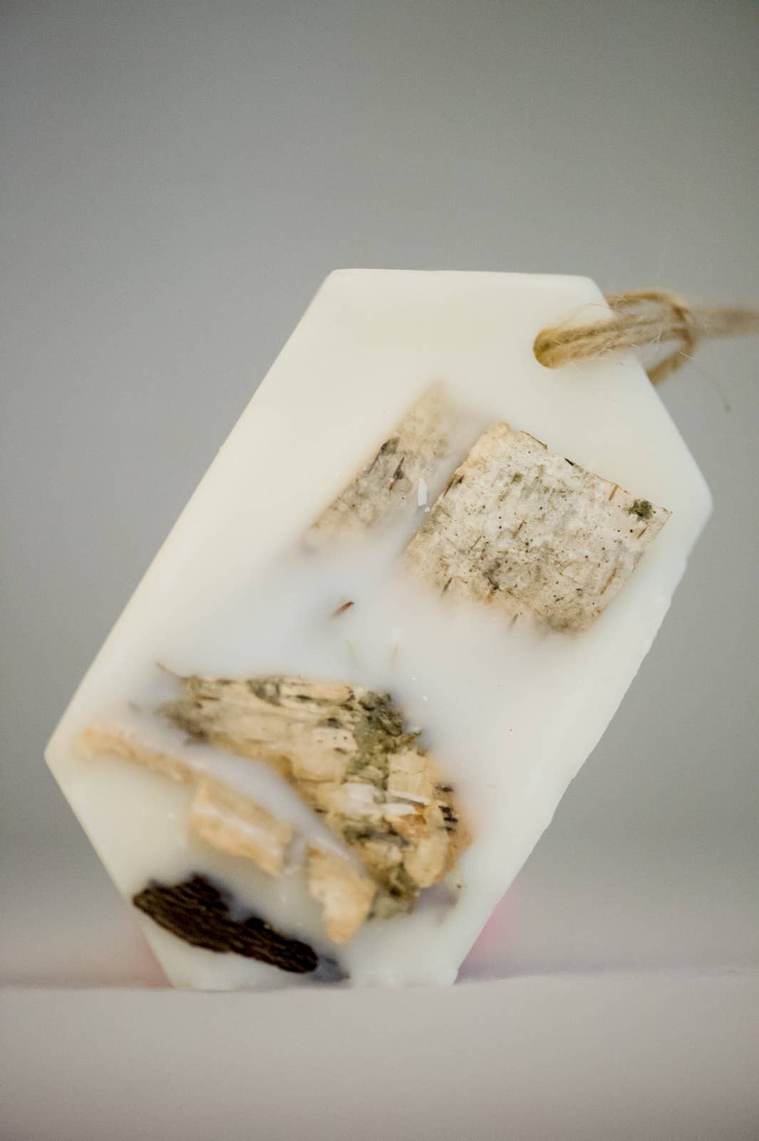 Scented soy wax sachet infused with birch essential oil and decorated with birch bark.