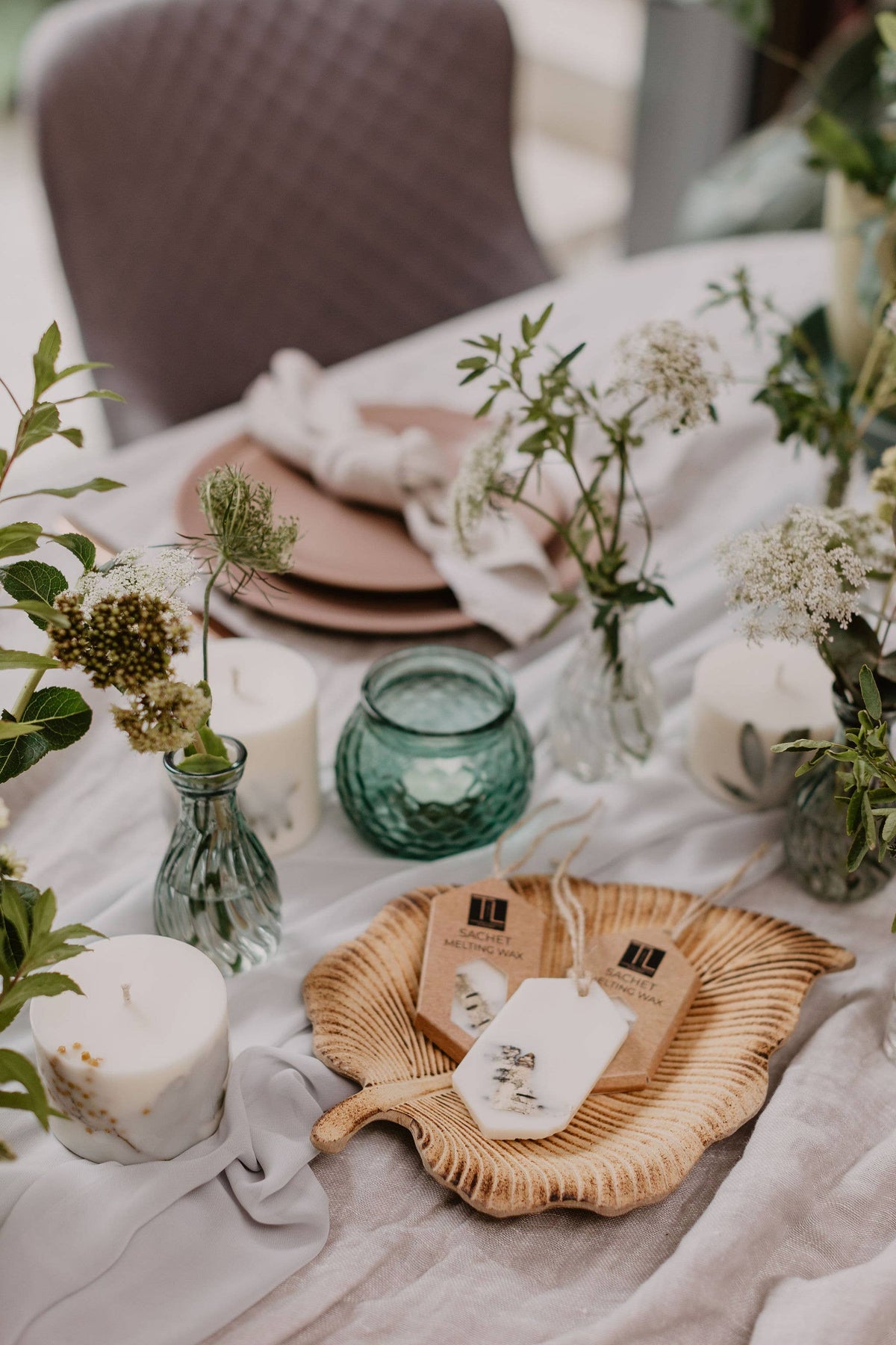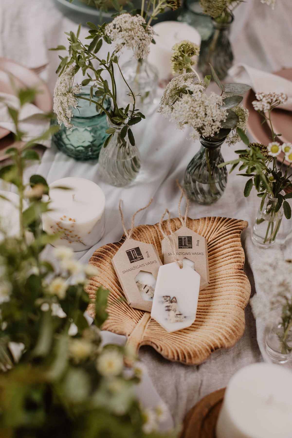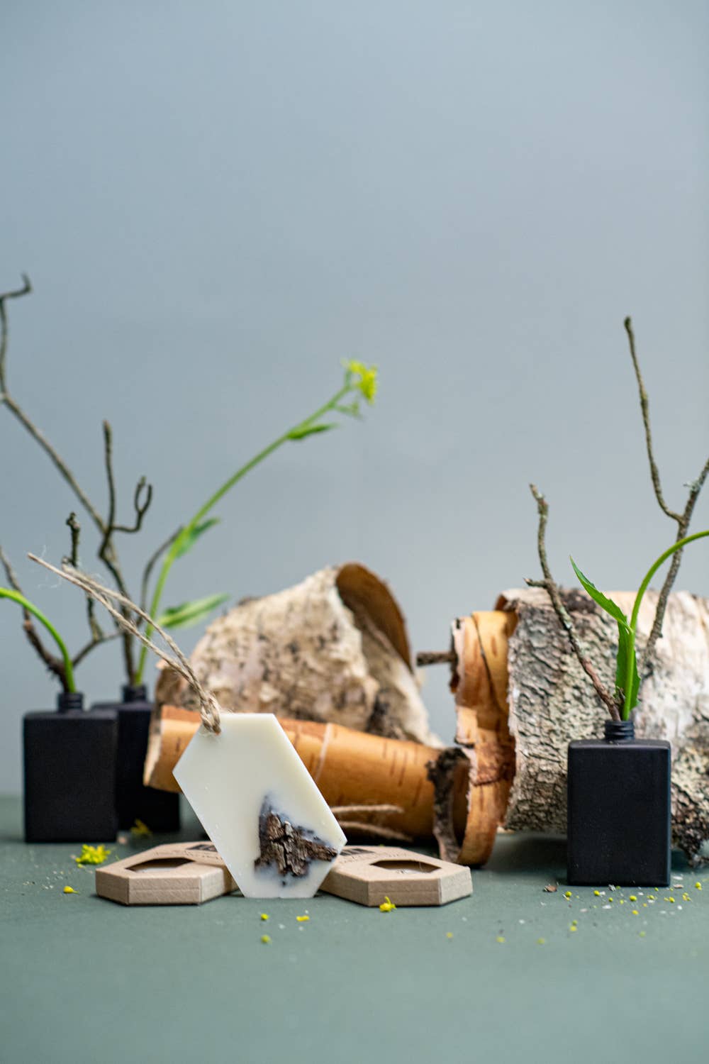 Scented soy wax sachet infused with birch essential oil and decorated with birch bark.