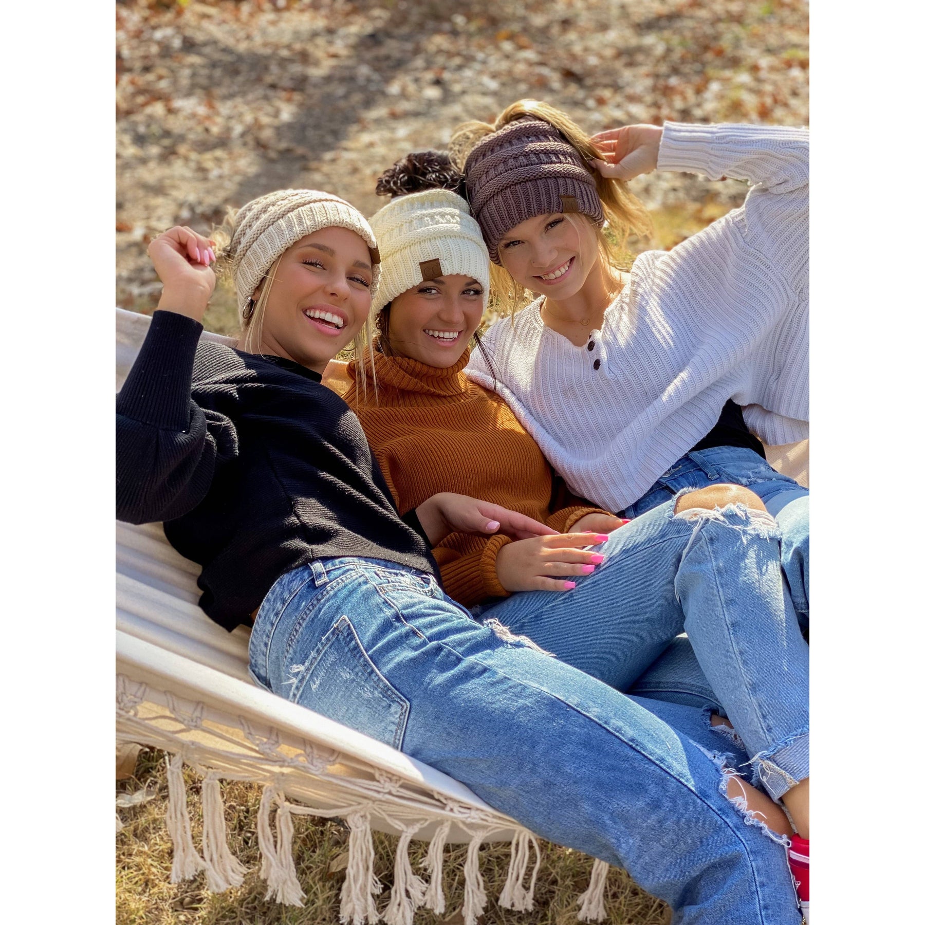 ALL NEW!  The original messy bun beanie now comes with a warm LINING!  This CC beanie tail beanie allows you to wear your favorite head gear on a cold day with a soft and cozy fuzzy lining, while pulling your hair off your ears and neck!  It features an elastic opening in the middle to keep the beanie in place without slipping!  This beanie is EXCLUSIVE to ccbeanie.com and supplies are limited!
