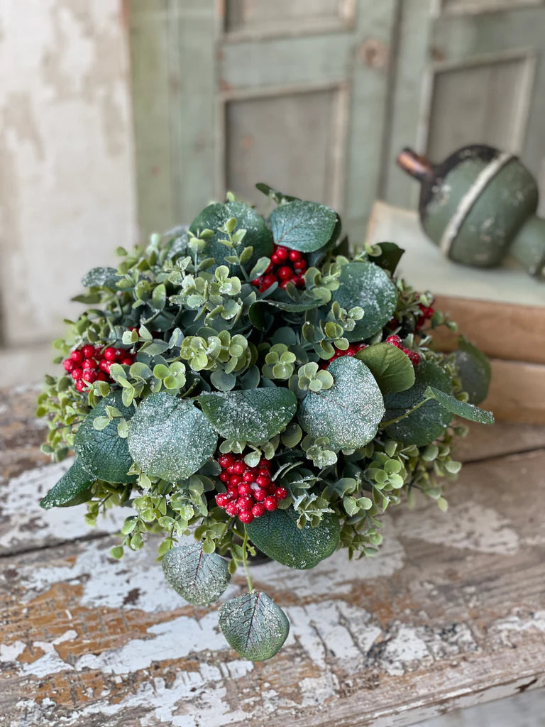 An gorgeous collection of mixed eucalyptus with striking clusters of red berries.  The leaves are topped with small ice chips and glitter to add extra interest.